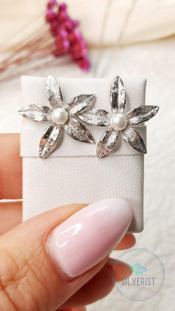 Lovely flowers studs with hammered silver and natural pearls.